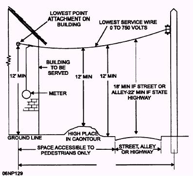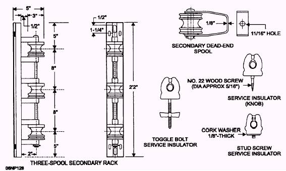 Figure 4-29.- Three-phase delta (A) primary and secondary system. an area is commercial, consisting of motors and other three-phase equipment. The other type of circuit is called the wye (Y) system (fig. 4-30) and is used primarily for residential use. SECONDARY CIRCUITS Secondary circuits (secondary mains) are circuits that originate from the secondary windings of a distribution transformer and are 600 Vac or less. The secondary circuits are also configured either delta (A) (fig. 4-29) or wye (Y) (fig. 4-30) and are also used for the same type of loading as the primary circuits. Secondary circuits are either three phase- meaning those with three live conductors- or single phase, which can be one live conductor and a neutral or two live conductors and a neutral. SERVICE DROPS A service drop is the combined conductors used to provide an electrical connection between a secondary distribution circuit and a user's facility. There are different ways of installing the service drop. Some typical secondary racks used to install service drops are shown in figure 4-31. Whether using the racks with individual conductors or self-supporting service cable, known as triplex or quadraplex, to provide a service drop, you must maintain a minimum aboveground distance. Aclearance of 12 feet over lawns or walkways accessible to pedestrians and 18 feet over roads or alleyways subject to truck traffic as recommended by the NEC(c), as shown in figure 4-32. When the nearest distribution pole is over 125 feet from the facility to be connected, an intermediate support pole must be provided. CONTROL AND PROTECTIVE DEVICES A power distribution circuit, like any other electrical circuit, requires the use of special devices to provide control and to protect the system from internal or external influences that may damage the circuit. DISTRIBUTION CUTOUTS A distribution cutout provides a high-voltage mounting for the fuse element used to protect the distribution system or the equipment connected to it.