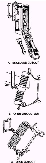 Figure 4-34.- Distribution cutouts (fused). Secondary arresters are used on service and other low-voltage alternating-current circuits. Distribution arresters are used on primary distribution systems to protect insulators, distribution transformers, and other equipment. Intermediate type of lightning arresters are often used on substation exit cables and other locations on the distribution system, needing a high level of lightning and surge protection. Substation types of arresters are used in substations and generating stations to provide a high level of surge protection for the major pieces of equipment. Surge voltages can be generated by operating switches in the electric transmission system as well as by lightning. Various types of lightning arresters are in use today. The valve, pellet, and air gap (fig. 4-35) are the most common and likely-to-be-seen types in the field. SWITCHES A switch is used to disconnect or close circuits that may be energized. High-voltage switches are operated remotely using a variety of mechanisms or manually. Depending on their purpose in the system and their physical makeup, switches are divided into three general classes: air, oil, and vacuum switches. These three classes can be further subdivided (depending on their function) into what is referred to as disconnects, circuit breakers, or reclosers.