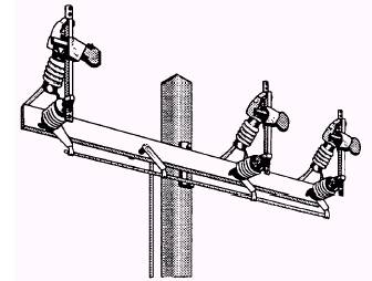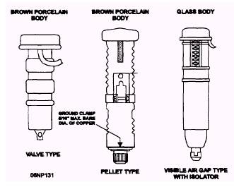 Figure 4-35.- Types of lightning arresters. An air-circuit breaker switch can have both blade and stationary contacts equipped with arcing horns (fig. 4-36). These horns are pieces of metal between which the arc forms when a circuit-carrying current is opened. These arc horns are drawn further and further apart until the arc finally breaks. Air-break switches are usually mounted on substation structures or on poles and are operated manually from the ground. In a three-phase circuit all three switches- one for each phase- are opened and closed together. An air-disconnect switch is not equipped with arcing horns or other load-break devices. It therefore cannot be opened while current is flowing (fig. 4-37). If the disconnect switch should be opened while current is flowing in the line, an arc would likely be drawn between the blade and its stationary contacts. The hot arc would melt part of the metal, thereby damaging the switch. The purpose of a disconnect switch is to isolate a line or a piece of equipment for the purpose of making the disconnected line or equipment dead electrically, thus making it safe for repairs, tests, or inspections.