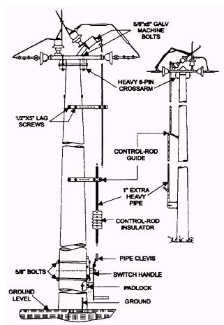 Figure 4-37.- Air-disconnect switch. Oil Switches An oil switch is a high-voltage switch whose contacts are opened and closed in oil. Oil switches may be used as disconnect, circuit breakers, or reclosers. The switch is actually immersed in an oil bath, contained in a steel tank, as shown in figure 4-38. The reason for placing high-voltage switches in oil is that the oil may help to break the circuit when the switch is opened. With high voltages, a separation of the switch contacts does not always break the current flow, because an electric arc forms between the contacts. If the contacts are opened in oil, however, the oil helps to quench the arc. Oil is an insulator and, therefore, helps to quench the arc between the contacts. The three lines of a three-phase circuit can be opened and closed by a single oil switch. If the voltage is not extremely high, the three poles of the switch are generally in the same tank. But if the voltage of the line is high, the three poles of the switch are placed in separate containers. Circuit Reclosers The circuit reclosers most commonly used in power distribution are electronic reclosers, oil reclosers, or vacuum reclosers. These reclosers basically operate in the same manner. Reclosers come in single-or three-phase models and can either be pole-mounted or installed in a substation. These reclosers are for overload protection and are designed to open a circuit in an overload condition and then automatically reclose the circuit. If the fault on the system has cleared, the recloser remains closed. If the fault has not cleared, the recloser trips again, and after a short interval, recloses the system for the second time. If the fault has not cleared on the third time, the system will open and stay open. The recloser also has a manual lever or electronic control to set the recloser on what is commonly referred to as "single-shot" action. When linemen are working in the general area of a circuit, they place the recloser in the single-shot mode. Then should a mistake be made, causing the circuit to trip, it will not reset itself automatically. POWER DISTRIBUTION EQUIPMENT The equipment most commonly used for construction and maintenance of Navy power distribution systems consists of the utility truck, aerial bucket truck, earth auger, pole trailer, wire trailer, and various manual lifting devices. UTILITY TRUCK The utility truck is a specially designed piece of equipment that, used effectively, provides the lineman with transportation, tool and material storage, and the