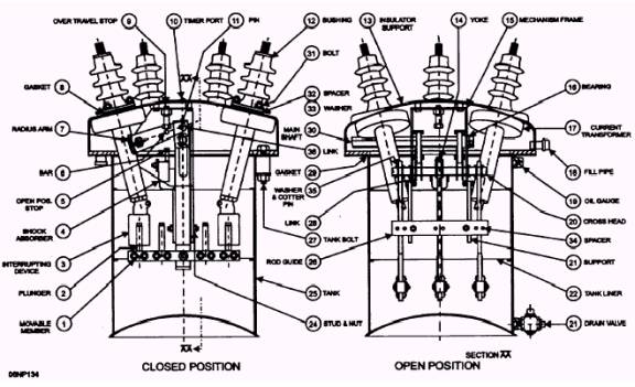Figure 4-38.- Internal and external components of an oil circuit breaker. capability to accomplish most tasks safely, efficiently, and quickly. AERIAL BUCKET TRUCK The aerial bucket truck comes in various shapes and sizes. It is used at most naval installations or battalions for maintenance or construction of the power distribution system. The aerial bucket truck provides the power lineman with an efficient, comfortable, and safe working platform and is especially useful in areas where concrete or steel poles are used. The aerial bucket truck has storage bins for material and tools. Depending on the make of the vehicle and the desired use, the truck may have a telescoping single-or double-arm boom, it may be equipped with hydraulic outrigger jacks for stability, and the bucket may be powered by the truck engine or an auxiliary engine mounted on the back of the truck. Because of the various designs of bucket trucks, each one will have some capabilities that are not common to all. When using an aerial bucket truck, you should follow the manufacturer's operation, maintenance, and testing procedures at all times. This promotes smooth operation and extends the usable life of the vehicle. When you are operating the bucket, safety of operation should be your prime concern. Although the bucket is insulated, all personnel should maintain a constant awareness of the hazards of operating in and around high-voltage power lines.