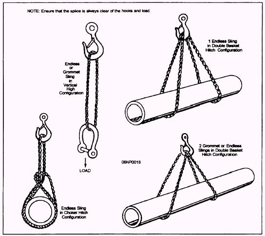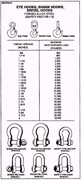 Figure 1-7 also shows the proper way to join two wire ropes. Fittings fittings are attached to the ends of wire rope so that the wire rope can be easily connected to other wire ropes, chains, pad eyes, or heavy equipment. Figure 1-8 shows some standard fittings. The type of fitting used depends on the job. For instance, to hoist a bundle of conduit from ground level, use two wire rope slings made using a thimble in the wire rope and then attaching a shackle to the thimble. A thimble in an eye splice reduces abrasive wear on the wire rope (fig. 1-8, view 2). Hooks and Shackles Hooks and shackles (fig. 1-9) provide a useful means of hauling the lifting loads without tying directly to the object with a line, wire rope, or chain. They can be attached to wire rope, fiber line, blocks, or chains. Shackles should be used for loads too heavy for hooks to handle. When hooks fail because of overloading, they usually straighten out and lose or drop their load. When a hook has been bent by overloading, do NOT straighten it and put it back into service. Cut it in half with a cutting torch and discard it. Hooks should be given a visual inspection at the beginning of each workday and before lifting a full-rated load. If you are not sure whether a hook is strong enough to lift the load, use a shackle. You should use hooks that close and lock where there is danger of catching on an obstruction. This applies particularly to hoisting buckets, or cages, and especially in shaft work. Hooks and rings used with chain should have about the same strength as the chain. SLINGS Slings are widely used in the moving and hoisting of heavy loads. You can obtain some types of slings already made up, but frequently you may have to make