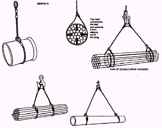 Figure 1-11.- Choker hitch formed by a single-leg sling. one end of each sling leg provides an adequate means for securing the sling to the load. Chafing gear (protective pads) must be used when a sling is exposed to sharp edges at the comers of a load. Pieces of round wood, heavy bagging, or old rubber tires are excellent materials to use as padding. |