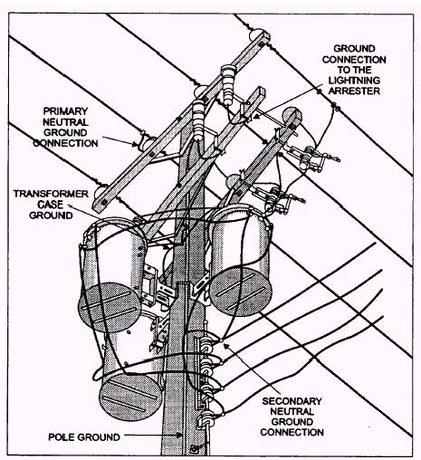 Figure 4-72.- Completely wired installation with wraparound mount showing grounding connections. To climb a wooden pole or tree, you will use the equipment shown