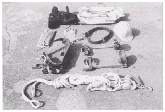 Figure 4-73.- Pole climbing equipment. Worn leather Enlarged tongue holes for belt buckles If you discover any of these defects, turn in the equipment and replace it. You must periodically perform maintenance work on the leather parts of your climbing equipment. Cleaning comes first. Use a damp sponge and a mild soap. Work up a thick, creamy lather. Then wash the soap off and wipe the belt with a dry cloth. Next, to make the genuine leather soft and pliable, lather well with saddle soap. Work the lather into all parts; then place the belt in the shade to dry. After the lather has nearly dried, rub down the leather with a soft cloth. Both belts and safety straps, made of genuine leather, require oiling about every 6 months. Be sure the leather is clean before applying oil. Use about 2 teaspoonfuls of neat's-foot oil, working the oil in gradually. Place the belt in a shady place and allow it to dry for 24 hours. Then rub it down with a soft cloth. Always, before you climb a pole or tree, inspect the climbers for the following defects: Broken or loose straps Stirrup worn to a thickness of one-eighth inch or less Length of pole gaff of less than one-fourth inch as measured along the inner surface Length of tree gaff of less than 5 1/ 2 inches as measured along the outer surface and of less than 3 1/ 2 inches along the inner surface Difference in gaff lengths of more than one-eighth inch If you find any of these defects, turn in your climbers for a new pair.