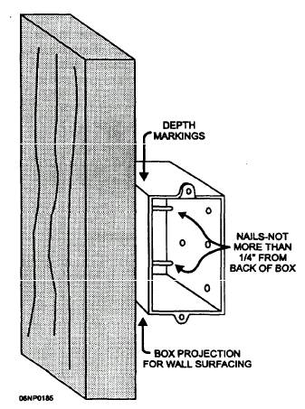 Figure 5-10.- Box installed with nails. Outlet and junction boxes are installed in a number of ways in either new construction or an old building. Article 370 of the NEC(c) gives the installation rules for outlet, switch, and junction boxes. In most cases, boxes in new construction are fastened with nails or screws. Usually, nails are preferred because they are cheaper and quicker to use. Unless the box has a bracket on it, the side of the box must be removed to use screws for mounting. Some of the newer box mounting brackets have prepunched and preformed devices that are driven into wood framing to support the box in the place of nails.