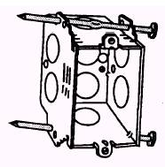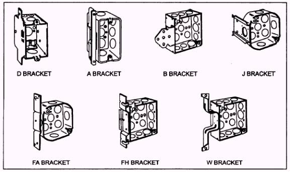 Figure 5-11.- S bracket box. Many boxes come with attached brackets of various designs. Several of these brackets are shown in figure 5-12. The D bracket illustration is the simplest one of the group and is simply an extended box side. It is nailed or screwed to the stud. It also has notches to serve as an installation guide. The next bracket is the A bracket. As you can see, it is a straight bracket with a turned over upper edge that fits over the edge (face) of the stud. When nailed from both the front and side, this bracket makes an extremely strong mounting. The A brackets come attached to the boxes at varying distances from their edges to allow for use with different thicknesses of wall material. The B bracket is made to fasten the box to the face of the stud. It has a couple of spurs that, when driven into the stud, hold the box in place while it is being nailed. The bracket may be attached to the box so it projects slightly above the edge, as shown in the illustration. This bracket prevents the device cover and its holding screws from causing a bulge when sheetrock is used for the wall surface. B brackets on device boxes are located at various depths to coincide with the thickness of the finished wall. Some B brackets are about twice as long as the one shown. These brackets are suitable for mounting on doorway framing studs to place switches and their cover plates beyond the edge of the door trim. This same bracket may be attached to the end of a device box for the horizontal mounting of a switch or receptacle. The J bracket is used the same as any other bracket that is fastened directly to the side of a stud. The holes are slotted to permit the box to be toenailed. The bracket is flush with the edge of the box and has gauging notches for positioning. This bracket has a knockout that allows installation of conduit through the stud into the box. The FA bracket is similar to the D bracket, except the bracket is welded to the side of the box. It also has a positioning spur to assist in holding the box in place while it is being nailed The bracket is offset from the edge of the box one-half inch or five-eighths inch to allow for the wall material thickness. The FH bracket is similar to the FA bracket, except it has two barbed hooks that drive into the face of the stud. The bracket is welded flush on square boxes and offset one-half inch on device boxes. Driving the barbed hooks into the stud face and nailing the side make a very rigid mount. The W bracket is fastened to both the face and side of the stud to provide a rigid mount. Since it stands the box off to the side of the stud, it is used to provide clearance between switches and switch plates and doorway trim, as does the long B bracket. Box Mounting on Metal Framing Much modem construction makes use of metal framing members. The ones you are concerned with mostly are the studs and the doorframes. Boxes can be attached with sheet metal screws or machine bolts and nuts. However, special attaching devices are available. A special anchor, as shown in figure 5-13, provides a