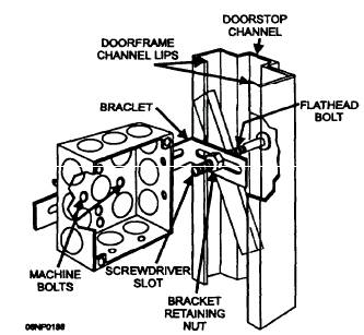 Figure 5-13.- Box mounting on metal doorframe. quick, simple method of installing a box on the doorframe. This anchor allows the box to be adjusted in all directions; that is, toward or away from the frame, the depth from the outside wall surface, and up or down as needed. The nut on the bolt shown in the figure holds the bracket to the anchor and must be loose while the anchor is installed. The anchor itself consists of a flathead bolt with a screwdriver slot and a threaded channel. The channel comes in two sizes; one for narrow doorframes not over 4 inches wide and a second for doorframes up to 7 inches wide. The anchor is set in place by inserting it in the frame channel with the flathead of the bolt toward the doorstop channel and the threaded channel under the lips of the doorframe. The anchor is locked in place by inserting a screwdriver in the slot of the bolt and turning it clockwise until tight. As you can see in the figure, the bracket is adjustable and is held in position by the tightened nut on the bolt. The box is adjustable toward or away from the doorframe and is attached to the bracket with two machine bolts and nuts. Metal spring clips provide a quick and easy way of mounting boxes onto metal studs. The same clip will work on studs of more than one design and size, such as 1 5/ 8-to 3 5/ 8-inch C channel studs and the truss type of studs. They are designed to mount square boxes with cover plates and to permit device boxes to be flush-mounted with various thicknesses of wall surfacing. A metal spring clip is shown at the left in figure 5-14. To mount a box, tap the clip over the open edge of the box. Then tip the box so the upper prong slips behind the face of the stud, as you can see at the right in figure 5-14. Press the lower prong back with your thumb until it slips