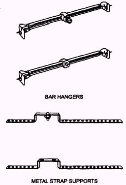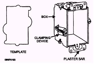 Figure 5-15.- Box supports. two typical bar hangers and two metal strap supports. You can see that one of the bar hangers includes a fixture stud that also serves to support the box when it is installed through the knockout in the box bottom. The other bar hanger supports the box by means of a clamp installed through the bottom knockout. Bar hangers with boxes already attached are available. Bar hangers come in different lengths with each having a range of adjustment to fit spaces of varying widths. Bar hangers are fastened in place by nails driven into the side of the joist or stud. Sheet metal screws or machine bolts and nuts are substituted for nails when metal framing is involved. Metal straps may have fixture studs or may have slotted mounting holes so the box may be attached with machine bolts and nuts. Strap supports come in different lengths with several nail holes in each end to fit various width spaces. Strap supports are nailed to the face of the joist or stud They have different offsets to fit different box depths or installation needs. Metal strap supports can be made similar to the manufactured one shown in the lower part of figure 5-15. Hole locations should be determined and holes drilled as needed for the specific installation being made. Wood supports can be made in a number of ways. About the simplest form is shown in figure 5-16. It consists of a piece of 1-by 4-inch lumber cut to length to fit between the joists and nailed in place. You need to allow for the depth of the box plus the thickness of the ceiling material when positioning the board for nailing. In some cases, two 1 by 4s may be nailed up with the wide dimension perpendicular to the joist or stud faces and the box mounted between them. Sometimes the ends of the 1-by 4-by 4-inch support is nailed to 1-by 4- by 4-inch blocks which, in turn, are nailed to the joists. Box Mounting in Existing Structures A completely different method of box mounting is required when a concealed extension is to be made to an existing circuit or when a new concealed circuit is to be added in an existing structure. The procedures discussed here pertain to mounting boxes in hollow walls; that is, walls, such as sheetrock or plaster on studs. Boxes must be equipped with plaster ears to assist in anchoring them in place. One method of hollow wall mounting is shown in figure 5-17. This method uses two sheet metal brackets to hold the box in place. The first step for this type of mounting is to locate and cut the mounting hole. After the hole is cut, hold the box in place in the hole with the plaster ears against the wall. Slip a bracket with the fins pointing out, long end first, between the box and the wall. Slide the bracket up until the short end clears the hole. Rush the short end into the hole and slide the bracket downward to center the fins with the box. Bend the fins tightly over the box edge and down against the inside. Repeat these steps for the second bracket. The box should now be held firmly in place. A second method of mounting a box in a hollow wall makes use of clamping devices attached to the box sides, as shown in figure 5-18. These boxes usually come with a stiff paper template to outline the hole that must be cut into the wall. If you do not have a template, put the box against the wall and draw around it. Be sure you do not include the plaster ears in your drawing. Cut the hole as indicated, Slip the box into the hole and tighten the clamping screws until the box is firmly anchored. One variation of this method works quite
