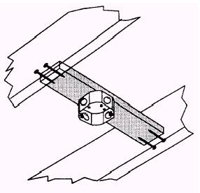 Box Mounting Between Framing At times, boxes must be mounted between the building or wall supports instead of directly on them. This positioning is particularly true of ceiling lights where the joists do not coincide with the spot at which the light is to be placed. In such cases, boxes must be mounted on a separate support attached to the structure. These supports may be purchased in the form of bar hangers or metal straps, or they may be constructed from metal straps or wooden strips. Figure 5-15 shows