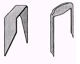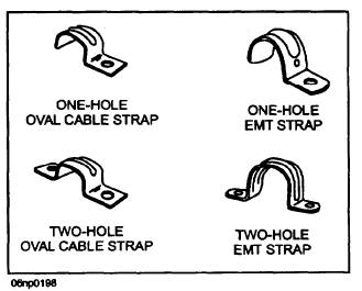 Figure 5-22.- Nonmetallic cable staples. later modifications. You should refer to Article 300 NEC(c) for wiring methods. When roughing in your circuits, study your electrical blueprints. They will show the general location of the outlets and switches and how the cable is to be routed. The exact spot where each outlet and switch are to be put is determined by the requirements of the NEC(c) and the experience of you, the electrician, unless specific directions are given. A straight line is the shortest distance between two points. This principle is used a great deal of the time by electricians when they are routing cables. Cable is run from box to box by the shortest route unless there is a good reason not to do this. Such routing does not always look neat, but it keeps the cost of material and labor down, and since most wiring is concealed, it is not often seen. Cable must be fastened in place to support it and to prevent strain at boxes and connections. Cable must be anchored within 12 inches of a box, cabinet, or fitting and at points no more than 4 1/ 2 feet apart between boxes. NM cable is usually attached to wooden framing studs by staples (fig. 5-22). Care must be taken not to drive the staples in tight enough to damage the cable. Another method for securing Romex is by the use of straps. Figure 5-23 shows four types of straps that may be used to secure cables. Concealed cable is installed either through holes bored in wooden framing studs or into notches cut in their edges. Holes can be bored with various sixes of bits, depending upon the size of hole needed. The holes should be drilled in the center of framing studs in a straight line and at the least possible angle either