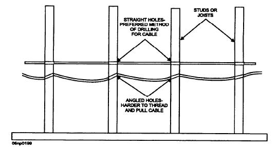 Figure 5-24.- Drilling holes for nonmetallic cable. vertically or horizontally, as shown in figure 5-24. Holes that are drilled in a crooked line or at much of an angle to the line of pull, as shown at the bottom of figure 5-24, make it harder to thread the cable through the holes and pull it into position. Cable can be placed into notches cut in the edge of the framing members and studs, as shown in figure 5-25, if the notches will not weaken the building structure. The notches should be as small as possible. Their depth must not exceed one fifth of the width of the wood. Cable placed in notches or through studs is protected from nails and screws by a thin metal plate at least one-sixteenth inch thick, according to the NEC(c), Article 300-4, like those in figure 5-25.