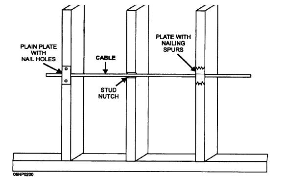 Figure 5-25.- Nonmetallic able installed in notches. Cable is installed through metal framing members in about the same way as it is in wooden ones. Either holes or slots are used and they must be cut, punched, or drilled at the factory or in the field. Normally, holes in metal members must have bushings or grommets inserted securely to prevent damage to the cable covering. If holes or slots have been formed so that no metal edge can cut or tear the cable insulation, bushings or grommets are not needed. Use good judgment when deciding whether or not grommets are required. A steel sleeve, plate, or clip must be installed for protection wherever a cable might be punctured or cut by a nail or screw. The first step in wiring a building after the distribution panel or panels have been installed is, in most cases, to mark the location of the outlet boxes. Then mount the boxes in place unless the mounting of a box might interfere with hole boring or cable anchoring. Once the boxes are in place, make the needed holes or notches for the installation of the cable. Install the cable by starting at the free end. Strip, as a minimum, 6 inches of the outside covering from the cable end. If the box has cable clamps, remove one of the knockouts and insert the stripped cable end through the hole under the clamp until one-fourth inch of the cable cover extends beyond the clamp. Tighten the clamp to hold the cable firmly in place, but be careful not to overtighten as this procedure