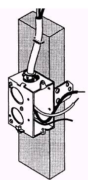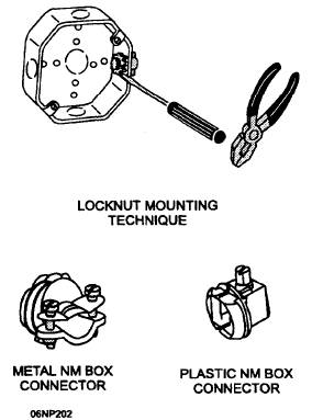 Figure 5-26.- Cable termination at box. could cause a short. This procedure will give you conductor ends 6 inches long in the box, as shown in figure 5-26. You need these ends so you can make splices or attach devices or fixtures easily. Remember to anchor the cable within 12 inches of the box, as shown in figure 5-26. Boxes without cable clamps require a little different procedure. After stripping the cable end, remove one of the box knockouts. Then install a cable connector, similar to the ones in figure 5-27, in the knockout hole. Install the locknut so that it points inward to dig firmly into the metal box as shown in figure 5-27. Put the cable end through the connector to expose one-fourth inch of the outer cover, and then fasten it in place, as shown in figure 5-25. After the free end of the cable is in the box, work the cable back toward the other box. Run the cable along the framing members, fastening it at points no more than 4 1/ 2 feet apart. When you get to the other box, cut the cable to length, allowing for 6 inches of free conductor in the box. Strip the outside covering, insert the cable end, fasten it to the box, and anchor it within 12 inches of the box. To help avoid damage to the wires as wall coverings are being placed and other construction is being done, make sure you tuck back the wires into the outlet box.