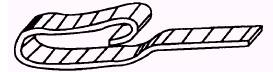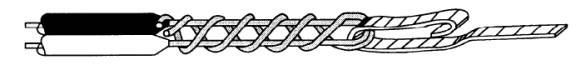 Figure 5-56.- Fish-tape hook. about 3 inches at the end of the tape until it is red-hot, and bend a hook on it about an inch long, like that shown in figure 5-56. This shape of hook seems to work best. After the hook is formed, reheat the end of the tape until it is red. Allow the end to cool until it becomes straw-colored. Then plunge it into a can of water until it is cool. This process restores the temper to the hook area. Once you have the fish tape in the conduit, attach the hook to the wires to be pulled, as shown in figure 5-57. Remove 4 to 6 inches of the insulation from the ends of the wires and thread the ends through the hook in opposite directions; bend them back and twist them around each other; then tape the hook and bare conductors to strengthen the attachment and make pulling easier. Use just enough tape to cover the hook and wires. Wire pulling usually takes two people-one to pull the fish tape and the other to feed the conductors into the conduit. The fish tape should be fed into the end of the conduit run from which it will be easiest to pull. It is usually best to pull the conductors from the distribution panel to the first box in the run, especially if the panel is energized. This procedure prevents your having to pull on the steel tape near an energized bus. WARNING Whenever conductors are being pulled into energized panels, be careful to keep clear of the bus bars. All energized parts should be covered with a rubber blanket. When several conductors must be fed into a conduit, you should keep them parallel, straight, and free from kinks and bends. Wires that are allowed to cross each other form a bulge and are hard to pull around bends. Whenever possible, feed conductors downward; for example, from the second floor to the first, so the weight of the wires will help in the pulling process. Another way to ease the pulling of conductors is to rub an approved lubricant, such as soap, talc, soapstone, or other noncorrosive substance, onto the insulation or blow it into the conduit. You may find that it is hard to keep the fish tape from slipping in your hands when you are pulling long runs or runs with several bends. When slipping is a problem, you can use the back side (insulation crushing point) of a pair of side-cutting pliers to grip the tape to give you a good pulling handle. Remember to leave at least 6 inches of free conductor at each outlet and switch box to make up splices or to connect devices. Conductors that are not spliced or connected to a device can be pulled directly through the box. The number of conductors you can have in conduit is based on the size of the conduit, the type of conductor insulation, and the size of the conductors. The NEC(c), chapter 9, has several tables to help you determine how many conductors of a certain size and insulation type you can have in a given size of conduit. These tables are based on fill; that is, the cross-sectional area of the conductors inside the conduit can take up only a certain percentage of the free space inside the conduit. You must use these tables whenever there is a question on the number of conductors to be pulled. Too many conductors in a conduit cause overheating, which reduces conductor ampacity. Once you have installed the conductors and all other finish work is complete, you are ready to do the electrical finish part. Finish work for conduit installations is the same as that for NM cable installations, which was covered previously in this chapter.