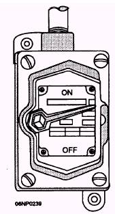 Figure 5-60.- Explosionproof ON-and-OFF lighting switch. sure that good installation practices have been observed and all connections are correct. While you are making this check, do not forget neatness. Make sure that ground connections are tight and that ground wire is protected against injury. Be sure that all connections in the entrance switch and panelboards are tight. See that all metal noncurrent-carrying parts of portable equipment are grounded