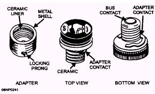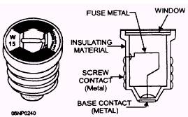 Figure 5-61.- Plug type of fuse. panelboard must not exceed 80 percent of its capacity where, in normal use, the load continues for 3 hours or longer to prevent overheating of the conductor. Panelboard cabinets must be grounded. A terminal bar must be provided for attachment of feeder and branch circuit equipment-grounding conductors where nonmetallic raceway or cable is used. This terminal bar must be bonded to the cabinet, but not to the neutral bar except in service equipment. Three-phase panelboards supplied by a four-wire, delta-connected system that has the midpoint of one phase grounded must have the higher voltage-to-ground conductor or bus bar marked. This high-voltage conductor should have an orange outer finish or be clearly tagged. The identification is required at any point where a connection can be made and the neutral conductor is also present. The phase arrangement on a three-phase panelboard is A, B, C, from left to right, or top to bottom when viewed from the front. The B phase will be the phase that has the higher voltage-to-ground. There are two basic types of panelboards: fuse panels and circuit breaker panels. Fuse panels, as the name implies, contain fuses for protection of each circuit. Fuse panels are designed in a variety of ways. These designs vary in size, capacity (amperage and voltage), and type of installed fuses. The capacity of the panel is based on the ampacity of the bus bars of the panel. The number of bus bars is determined by whether the panel is single-phase or three-phase. Fuse panels are designed for plug fuses, cartridge fuses, knife-blade fuses, or a combination of these. Fuse panels use an Edison-base fuse that screws into a socket similar to the medium-based light socket. Fuse panels still exist but are not very common. Fuse panels are not to be installed either for new work or as a replacement panel unless they have been modified to accept Type S fuses. Refer to figure 5-61 for a view of the plug type of fuse and figure 5-62 for a view of the adapter and Type S fuse.