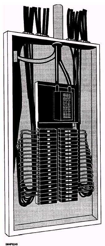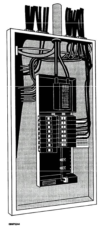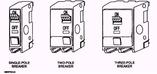 Figure 5-65.- Typical circuit breakers. does not open immediately when an overload occurs. The bimetallic element requires a short time (length depends on the size of the overload) to respond to the heat generated by the overload current. A magnetic type of circuit breaker responds instantaneously when an excess of current flows through the breaker. A small electromagnet is used to actuate the breaker mechanism. Whenever a predetermined amount of current flows through the electromagnet, enough magnetic flux is created to attract a small armature. As the armature moves, the breaker mechanism trips and opens the circuit. The thermal-magnetic circuit breaker, as the name implies, combines the features of both the thermal and the magnetic types. Of the three, the thermal-magnetic circuit breaker is preferred for general use. A small overload actuates the bimetallic strip to open the circuit on a time delay, while a large overload or short circuit actuates the magnetic trip to open the circuit instantaneously. Circuit breakers are rated in amperes and volts the same as fuses and you select them on the same basis. Circuit breakers are sealed units and no attempt should be made to repair them or to adjust the ampere capacity. A defective breaker must be removed and replaced. 5-34 Circuit breakers that are to be used in circuits that may pose an added hazard to the user are made with an extra safety feature. This breaker is called a ground fault circuit interrupter (GFCI). It is a thermal-magnetic breaker with an additional internal circuit that detects a current leak from the hot wire to ground and opens the breaker if that current reaches a set amount. This leakage cannot be more than 5 ( 1) milliamperes (thousandths of an ampere) to ground. Most of these breakers have a test button that can be used to check the GFCI to see if it will trip when there is a fault. To install the GFCI, you connect the circuit hot wire to the breaker the same as you do on a standard breaker. The circuit neutral is connected to another terminal on the GFCI instead of to the neutral bar in the panel. The GFCI comes with an attached white neutral wire, which you then connect to the neutral bar. The NEC(c) requires that GFCIs be installed for several circuits used in the home. These circuits include ALL 120-volt, single-phase, 15-and 20-ampere receptacles in bathrooms, garages, and outdoors. GFCIs may be used elsewhere when there is a need for the added protection. Now that we have discussed the various types of panelboards, fuses, and circuit breakers, we need to discuss panelboard connections. Once the circuits have all been brought into the cabinet, the panelboard can be mounted in the cabinet. Also, the neutral bar and the equipment ground bar are attached to the cabinet. The ground bar must be bonded to the cabinet by either a bonding jumper or the more common method of running a screw through the bar into the cabinet. The equipment ground bar and the neutral bar are not bonded together unless the panelboard also serves as the service equipment. Quite often the panelboard is not connected until the interior wiring is done and the receptacles, switches, and fixtures have been installed. The method of attaching circuit conductors is based on conductor size and type of terminals on the panelboard. Small conductors, No. 10 and smaller, are normally looped around a screw type of terminal. Larger conductors may need to have terminal lugs, attached so the connection can be made to screw terminals. Pressure types of terminals are often provided for larger conductors, neutral conductors, and equipment-grounding conductors. Conductors should be connected in a neat and professional manner. In many cases, conductors are connected with little excess wire. Conductors brought in through the sides of the cabinet are connected directly to the overcurrent device. Those brought in from the top or bottom of the cabinet are bent neatly opposite the fuse or circuit breaker to which they are to be attached and cut just long enough to make a good connection, as shown in figure 5-66. However, many experienced electricians feel that this system of connecting conductors is not necessarily the best, even though it presents the most uncluttered look and leaves more space around each conductor. These electricians usually try to leave an end on each conductor that is equal to the height plus the width of the cabinet. Each conductor is run along the panel and looped back 180 degrees before being connected to its fuse or circuit breaker. This method is shown in figure 5-67. Little added material is needed, and the extra length on the conductor permits it to be switched to another terminal on the panel if desired. Also, in the case of conductor breakage near the terminal, the conductor can be reconnected easily. The ungrounded conductors in a fuse panelboard are connected directly to terminals on the bus bars. In a circuit breaker panelboard, the underground conductors are usually connected to the circuit breaker. The circuit breaker is then inserted in the panelboard. In most cases, the breaker is snapped into place and is held by spring tension. Sometimes breakers are held in the panelboard by a screw.