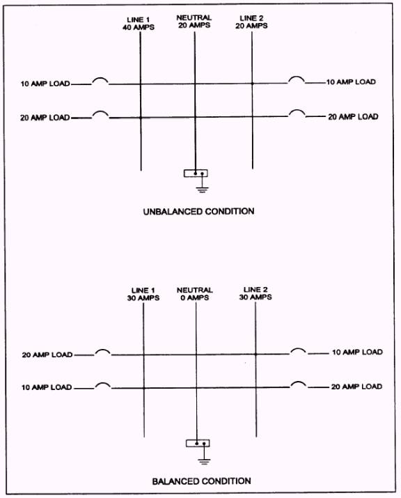 Figure 5-68.- Load balancing. 2. If you do not find the trouble, or open, by a visual check, use a voltmeter to determine whether the circuit is live (operating) up to the point of the component. A SHORT CIRCUIT results when two bare conductors of different potential come into contact with each other. If a conductor inadvertently contacts a metallic part of a wiring system, such as a motor frame or conduit, the system is sometimes said to be GROUNDED instead of having a short circuit. Grounds or short circuits can be (1) solid, (2) partial, or (3) floating. This situation presents a serious safety hazard because the machinery may be in operation, even though it has a short circuit. This condition is especially true in motors and some appliances. A solid ground or short circuit is one in which a full-voltage reading is obtained across the terminals of a blown fuse when the load is disconnected from the circuit. The circuit resistance, in this case, is quite low, and the current is quite high so that the fuse will blow. A partial short or ground is one in which the resistance between the phase wires, or between the phase wire and the ground, is partially lowered. However, enough current still remains to blow the fuse. Grounds of this type are generally more difficult to locate than are solid grounds. A floating ground is a condition in which the resistance of the defect in a system varies from time to time. Grounds of this type may be present in an electrical system for some time before their existence becomes known. A floating ground is indicated when fuses are blown on the phase side of a circuit a number of times, and a circuit test shows no defects in the system. In grounds of this type, fuse trouble may not occur for several days. Then the ground recurs, and the fuses are blown again. The procedures used to repair the troubles mentioned thus far are usually fairly simple. In the case of an open, short, or ground in NM cable, the bad section from box to box can simply be replaced using the same procedures outlined for installation. Another method would be to cut the cable at the trouble spot, install junction boxes, and add a short piece of cable to replace the bad section. Although the latter is the cheapest, it may not be possible if the trouble is concealed. Remember, you must have at least 6 inches of free conductor in a junction box to make the splices. Once you find out where the trouble is in a conduit system, the repair procedure is even easier. All that is required is to pull the open, shorted, or grounded conductor out and replace it with a new one. This replacement can be done by attaching the new conductor to the one that is to be removed. In any case, a little common sense and knowledge of the NEC(c) requirements will dictate the action you should take.