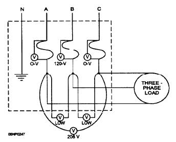 METERS Many times a visual inspection does not uncover an apparent problem; therefore, you must advance to troubleshooting with meters. In electrical troubleshooting, you will use voltmeters, ohmmeters, ammeters, and the meter that incorporates many meters- the multimeter. When using a voltmeter, you have to connect the power to the circuit before testing. On the other hand, you cannot use the ohmmeter on an energized circuit. You need to start voltmeter tests at the power input end of the circuit, whereas you start ohmmeter tests at the ground end Electrical circuit troubles develop either in the wiring or in the operating unit. If you analyze the problem carefully and take systematic steps to locate it, not only will you save much time and energy, but you will also prevent damage to expensive equipment. Either dead circuits or live circuits can be tested with instruments. Circuit defects can sometimes be located more easily by one method than the other, depending upon the type of circuit and the trouble. To test a dead circuit, disconnect the device from the outlet or disconnect switch. Equipment for this method of testing includes such units as ohmmeters and battery-powered test lamps. Asuitable continuity tester can be made easily from a flashlight in an emergency. An ohmmeter that contains its own batteries is excellent for continuity testing. A basic factor to consider in choosing continuity test equipment is to use relatively low-voltage instruments, reducing the danger of sparking. WARNING When connections are made in the presence of combustible vapors, sparking is a serious fire hazard. When you test live circuits, energize the circuit under test from the power source. Generally, you will test with a voltmeter. Make certain that the voltmeter is designed for the type of current to be tested and has a scale of adequate range. Ensure that the circuit is disconnected from the power source before making the necessary circuit changes; then reapply the power. WARNING Be extremely careful not to touch the hot conductors when you use this method of testing because these live points of the circuit are exposed when the junction box covers are removed. Let us troubleshoot a circuit with a voltmeter. The power to the circuit must be turned on. The first and most logical place to check is the fuse or circuit breaker panel. Set the voltmeter to the proper scale. If you do not know the value of the incoming voltage, set the meter to the highest scale; then work down to the proper scale. Check each incoming phase by connecting one lead of the voltmeter to the neutral and the other to each phase separately. On a three-phase 120/ 208, 240-volt service, you must get 120 volts on each phase to ground. Less than 120 volts on one phase means that phase is open and you are getting a feedback from equipment connected to the lead side of the panel. Sometimes there will be a slight variation of normal voltage from the different phases; therefore, to determine if one phase is dead, check between the phases. To perform this test, place one lead of the voltmeter on Phase A and the second lead on Phase B and read the voltage. It should read approximately 208 or 240, depending upon the system. After you have taken this reading, move the second lead to Phase C and take the reading. After this reading, move the first lead to Phase B and take the reading. You have now read between all phases and a lower than normal reading indicates an open phase. Which phase is dead? Assume that Phase B has a blown fuse. When you take your reading between Phases A and B (fig. 5-69). you get a low-voltage reading. Your next reading, between Phases A and C, reads normal. But the next reading, between Phases B and C, again is a low reading. Each time you read to Phase B, you get low voltage. This reading is a good indication that Phase B is open. Another way to determine which phase is open is to place one voltmeter lead on the top of the fuse and the other lead on the bottom of the same fuse. If you get a voltage reading across the fuse, that fuse is open.