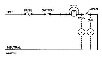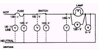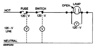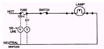 Figure 5-72.- Circuit with burned-out lamp. fuse and no voltage at the other. Since the fuse is a conducting unit. normally the same voltage reading should occur between both sides of the fuse and the ground. The only conclusion in this case, then, is that the fuse is open. Figure 5-72 shows that there is a voltage reading when the voltmeter is connected across the lamp. The logical assumption is that the lamp is inoperative. To be sure the lamp is inoperative, you must check it with an ohmmeter. Fuses, switches, and lamps are vulnerable; and you should check them first in a circuit. In figure 5-73. the lamp does not light and the voltmeter shows voltage from the ground screw of the lamp to the neutral wire. These conditions indicate an open in the ground wire. When you connect the voltmeter at another point at the right of the lamp and no voltage is indicated, you can assume that there is an open in the wiring between this point and the lamp connection. In figure 5-74, you find two lamps wired in parallel so that they can be controlled by a double-throw switch. With the switch in the OFF (center) position, there is no complete circuit, and neither lamp lights. When the switch is in the BRIGHT position, a circuit is completed through the switch and through both lamps. With the switch in this position, the only resistance in the circuit is the resistance of the lamps. When the switch is in the DIM position, the circuit is completed through the lamps as before; but this circuit has an additional resistor in series with the lamps. This added resistance causes a decrease in current flow; therefore, the lamps glow with less intensity than before. If one of the lamps lights and the other one does not, it is not necessary to check the complete circuit to find the open. The part of the circuit up to Point A is common to both lamps, and that much of the circuit must be completed for even one lamp to light. The place to begin checking the circuit is after Point A in the affected part of the circuit. In a circuit, such as the one shown in figure 5-74, it is best to use a voltmeter to locate the trouble. If you connect the negative lead of the voltmeter to the ground and the positive lead to Point A, you will get a reading on the voltmeter scale because Point A is connected through the switch to the positive line wire. If the positive lead of the voltmeter is moved in succession from A to B to C, you are able to check the continuity of wires AB and BC. If the check at Point C reveals no voltage, this condition indicates that wire BC is open. You can make this same check with an ohmmeter, but several additional steps are required. First, remove power from the circuit by placing the circuit breaker and circuit switch in the OFF position. Next, disconnect the junction of wires at Points A and C. Then, with one ohmmeter lead placed on the loose wire at A and the other one on B, check the continuity of the wire. When this check is made and the ohmmeter indicates a low resistance, you have continuity in the wire. But if you place one ohmmeter lead on B and the other on the disconnected wire at C and you get an infinite resistance, there is an open in the wire.