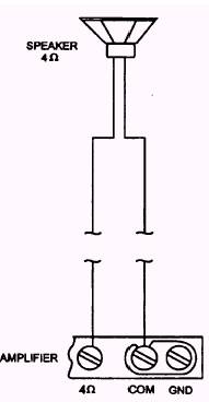 Figure 6-1.- Total speaker impedance matches the output impedance of the amplifier. The output speaker voltage will be either 25 or 70.7 volts. The speaker will have a microphone precedence over other input singles and four output terminals with circuit protection. Speaker installation is an important element whenever you install a P. A. system. No matter how good the amplifier is, if the speaker installation is not done properly, the sound produced will be inadequate. There are a number of factors you must consider when you install speakers. The placement and connection of speakers is the most important step. For indoor systems, two types of placement can be used. The speakers may be placed flat against a wall and the speaker turned so that it will radiate sound at an angle from the wall. The other type of placement is to mount the speakers in the corners of a room; for example, alcoves, balconies, booths, and dividing walls. A variation of these two methods mentioned may be considered for installation. For outdoor systems, the main considerations are the area to be covered and the direction of sound. Highly directive trumpet speakers are normally used for an outdoor area. When connecting speakers together, you must consider impedance matching and phase relations. Mismatching the impedance of a speaker to an amplifier output in either an upward or a downward manner will produce different effects. Mismatching upward (connecting an 8-ohm speaker to the 4-ohm output) will affect the power delivered to the speaker. Power loss will be about proportional to the upward impedance mismatch; in this case, about 50 percent. As a general rule, no serious frequency response deficiency will be noted and cannot damage a well-designed amplifier. Mismatching downward (connecting a 4-ohm speaker to an 8-ohm output) should always be avoided. It will reduce the amplifier power output and cause an overload on the output side with possible damage to the amplifier. Figure 6-2 shows an example of two speakers connected in series. Add the individual speaker impedances together to obtain the total matching impedance. The formula for this where Z = impedance is Zt = Z1 + Z2. For parallel connection (fig. 6-3) add the reciprocal of the individual speaker impedances together to obtain the reciprocal of the total matching impedance. The formula for parallel connections is as follows: For series/ parallel connections, combine the two formulas as the speaker connections indicate; for example, see figure 6-4, and apply the series formula for