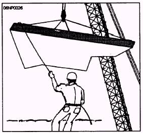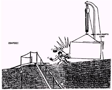 PROCEDURES AND PRECAUTIONS FOR LIFTING OPERATIONS The most important rigging precaution is to determine the weight of all loads before attempting to lift them, to make ample allowances for unknown factors, and to determine the available capacity of the equipment being used. In cases where the assessment of load weight is difficult, safe load indicators or weighing devices should be fitted. This chapter also includes a section dealing with the estimation of load weights. It is equally important to rig the load so that it is stable. Unless the center of gravity of the load is below the hook, the load will shift. The safety of personnel involved in rigging and hoisting operations largely depends upon care and common sense. Remember these safe practices. Know the safe working load of the equipment and tackle being used. Never exceed this limit. Determine the load weight before rigging it. Examine all hardware, equipment, tackle, and slings before using them and survey defective components. Discarded equipment may be used by someone not aware of the hazards or defects. Never can-y out any rigging or hoisting operation when the weather conditions are such that hazards to personnel, property, or the public are created. You must carefully examine the size and shape of the loads being lifted to determine if a hazard exists during high wind speeds. Avoid handling loads that have large wind-catching surfaces that could cause loss of control of the load during high or gusty winds. The wind can critically affect the loading and load-landing operation and the safety of the personnel involved (fig. 1-16).