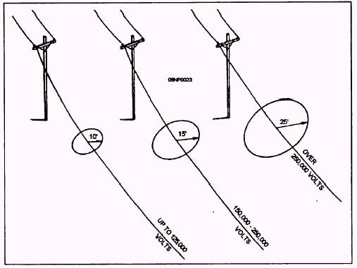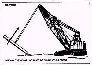 Figure 1-17.- Minimum safe distance for working around energized conductors. The primary killer of riggers and those persons handling loads is electrocution caused by the contact of the boom, load line, or load of a crane with electric power lines. When working with or around cranes that are within a boom's length of any power line, you must ensure that the power to that section of line is secured. If for some reason this cannot be accomplished, a competent signalman must be stationed at all times within view of the operator to warn him when any part of the machine or its load is approaching the minimum safe distance from the power line (fig. 1-17). You must also exercise caution when working near overhead lines that have long spans, as they tend to swing laterally because of the wind, and accidental contact could occur. The safe working loads of hoisting equipment apply only to freely suspended loads on plumb hoist lines. If the hoist line is not plumb at all times when handling loads, then additional side loads will endanger the stability of the equipment. In circumstances such as this, structural failures can result without any warning (fig. 1-18). Never use kinked or damaged slings or hoist wire ropes. To provide maximum operating efficiency and safety, you should give all slings and fittings thorough periodic inspections as well as daily inspections for signs of wear and abrasion, broken wires, worn or cracked fittings, loose seizing and splices, kinking, crushing, flattening, and corrosion. Special care should be taken in inspecting the areas around thimbles and fittings.