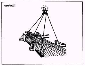 Figure 1-22.- Before loads are unhooked, they must be properly blocked. Never allow the load to be carried over the heads of any personnel. Never make temporary repairs to a sling. Procedures for proper repairs to a damaged sling should be established and followed Remove or secure all loose pieces of material from the load before it is moved. Make sure that the load is free before lifting and that all sling legs are taking the load.