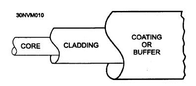 6-6.- Basic structure of an optical fiber. tube. Figure 6-7 shows each type of fiber buffer. The choice of buffering techniques depends on the intended application. In large fiber count commercial applications, manufacturers use the loose-tube buffers. In commercial building and Navy applications, manufacturers use tight buffers. CABLE STRENGTH AND SUPPORT MEMBERS fibers, glass fibers, and glass reinforced plastics. Fiber-optic cables use strength members to increase the strength of the cable and protect the fiber from strain. Fiber-optic cables may use central support members in cable construction The central support members generally have buffered fibers or single fiber subcables stranded over their surface in a structured, helical manner. The central members may support the optical fibers as cable strength members or may only serve as fillers. Strength and support members must be light and flexible. The materials used for strength and support include steel wire and textile fibers (such as nylon and arimid yarn). They also include carbon CABLE JACKET MATERIAL The jacket, or sheath, material provides extra environmental and mechanical protection. Jacket materials may possess any number of the following properties: Low smoke generation Low toxicity Low halogen content Flame retardance Fluid resistance High abrasion resistance Stable performance over temperature It is difficult to produce a material compound that satisfies every requirement without being too costly. Jacket materials currently used include polyethylene, polyvinyl chloride, polyurethane, and polyester elastomers. Most commercial jacket materials are unsuitable for use in naval applications.