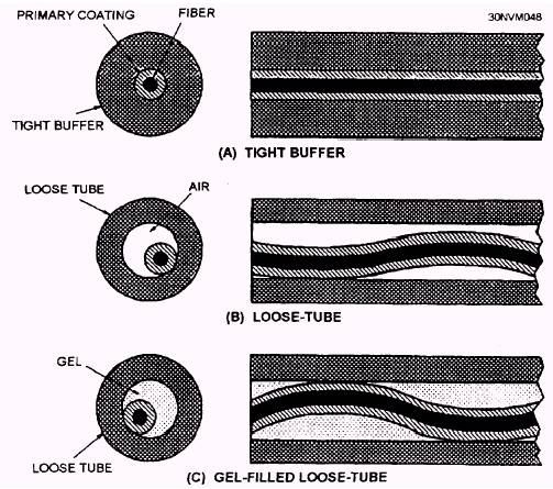 Figure 6-7.- Tight-buffered, loose-tube, and gel-filled loose-tube buffer techniques.