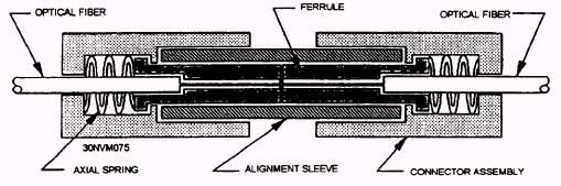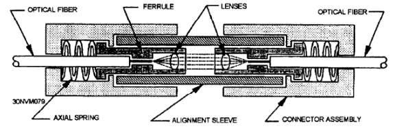 Figure 6-9.- Basic ferrule connector design. Butt-jointed connectors and expanded-beam connectors are the two basic types of fiber-optic connectors. Fiber-optic butt-jointed connectors align and bring the prepared ends of two fibers into close contact. The end faces of some butt-jointed connectors touch, but others do not. depending upon the connector design. Types of butt-jointed connectors include cylindrical ferrule and biconical connectors. Figure 6-9 shows a basic ferrule design. Fiber-optic expanded-beam connectors use two lenses to first expand and then refocus the light from the transmitting fiber into the receiving fiber. Single fiber butt-jointed and expanded-beam connectors normally consist of two plugs and an adapter (coupling device) (fig. 6-10). Expanded-beam connector shown in figure 6-11 uses two lenses to expand and then refocus the light from the transmitting fiber into the receiving fiber. Expanded-beam connectors are normally plug-adapter-plug type connections Fiber separation and lateral misalignment are less critical in expanded-beam coupling than in butt-jointing. The same amount of fiber separation and lateral misalignment in expanded-beam coupling produces a lower coupling loss than in butt-jointing; however, angular misalignment is more critical. The same amount of angular misalignment in expanded-beam coupling produces a higher loss than in butt-jointing. Also, expanded-beam connectors are much harder to produce. Resent applications for expanded-beam connectors include multifiber connections, edge connections for printed circuit boards, and other applications. FIBER-OPTIC COUPLERS Some fiber-optic data links require more than simple point-to-point connections. These data links may be of a much more complex design that requires multiport or other types of connections. In many cases, these types of systems require fiber-optic components that can redistribute (combine or split) optical signals throughout the system. One type of fiber-optic component that allows for the redistribution of optical signals is a fiber-optic coupler. A fiber-optic coupler is a device that can distribute the optical signal (power) from one fiber among two or more fibers. Also, a fiber-optic coupler