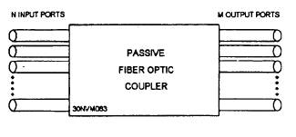 Figure 6-12.- Basic passive fiber-optic coupler design. candlepower [candela], hence the name (fig. 6-13). A candle radiates light equally in all directions. If you imagine such a source surrounded by a transparent sphere of one foot [meter] radius (figure) than by definition, the amount of luminous energy (flux) emanating from one square foot [meter] of surface on the sphere is one lumen [lumen], abbreviated lm. Since there are 40 square feet [meters] of surface area in such a sphere, it follows that a source of one candlepower [candela] intensity produces 40 or 12.57 lm (a lumen is a unit of light quantity), and in terms of power is equal to 0.0015 watt. It therefore also follows that 1-cp [cd] source produces 12.57 times 0.0015 watt; that is, 0.0189 watt or approximately 1/ 50 watt of luminous energy. The lumen, as luminous flux, or quantity of light, is comparable to the flow of current in an electrical circuit One lumen of luminous energy occurrence on one square foot of area produces an illumination of one footcandle (fc). When the area is expressed in square meters, the illumination is expressed in lux (lx). If you were to consider a light bulb to be comparable to a sprinkler head, then the amount of water released would be the lumens and the amount of water per square foot (meter) of floor area would be the footcandles [lux]. The metric unit, lux, is smaller than the corresponding order to change footcandle to lux, you would multiply by 10.764. Restating what you have just learned mathematically, it would look like this: footcandles = lumens square feet of area Or lux= lumens square meter of area High Intensity Discharge Lighting Efforts to improve the power efficiency and reduce the maintenance costs led to the development of a new family of lighting that has been generally categorized as high--intensity-discharge lamps (HID). These lamps all have a negative-resistance characteristic. This means that the resistance decreases as the lamps heat up. As the resistance decreases, the current increases. In fact, the current will increase indefinitely unless a current--limiting device is provided. All gaseous conduction HID lamps, therefore, have current limiters, called "ballasts." Lamp life and more light per watt are two main advantages that HID lamps have over incandescent bulbs. The basic types of HID lamps used unit, footcandles, by a ratio of approximately 10 to 1. In in area lighting consist of three groups of lamps: