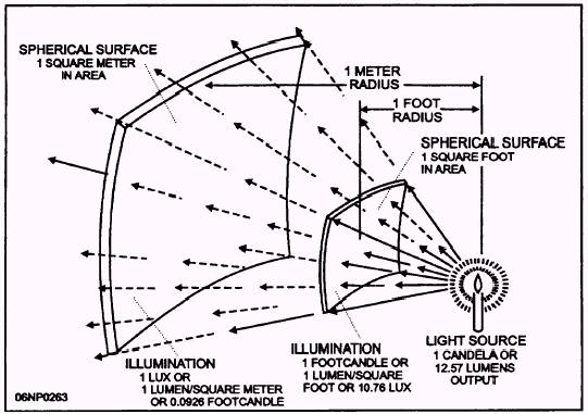 Figure 6-13.- Relationship between a light source of one candlepower and the illumination produced. mercury lamps, metal halide lamps, and high-pressure sodium lamps. All high-intensity-discharge lamps produce light from an arc tube that is usually contained in an outer glass bulb. Figure 6-14 shows the basic configuration of a HID lamp. In these lamps, a material, such as sodium, mercury, or metal halide, is added to the arc tube. In design, the lamp has three electrodes- one acting as a cathode and the other as an anode with the other electrode being used for starting. The arc tube contains small amounts of pure argon gas, halide salts, sodium, and vapor to aid in starting. Free electrons are accelerated by the starting voltage. In this state of acceleration, these electrons strike atoms and displace other electrons from their normal atomic positions. Once the discharge begins, the enclosed arc becomes the light source. Commercial companies that produce these light bulbs claim a 100-percent increase in lamp life over tungsten filament bulbs that produce the same amount of light. The power in watts required to operate these lamps is less than one half of that required for filament lamps. The initial cost of the components for lights is