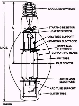 Figure 6-14.- HID lamp configuration. substantially greater as these lights will require ballasts; however, this cost can be made up later by the savings of energy costs. The selection of lighting fixtures will depend on budgeted dollars for new installation projects versus maintenance dollars. Most discharge lighting fixtures are supplied with the required ballast installed in the fixture. In some cases ballasts, usually called transformers, are externally installed.