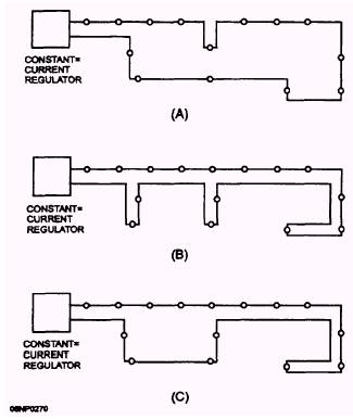 Figure 6-16.- Series street-lighting circuit. entire circuit. The use of film-disk cutouts (fig. 6-17) in the lamp socket prevents lamp failure from interrupting the circuit. The cutouts consist of two metal disks separated by a thin film of insulating material. The insulating film is held in place by the spring pressure of the contact disks. When the filament of the lamp burns out, the entire circuit voltage appears across the film disk. This is more than sufficient to puncture the film and close the circuit between the two metallic disks, thereby bypassing the burned-out filament. In later series circuits, an isolation transformer is used to eliminate the need for the film disk fixture. The primary winding of the isolation transformer is connected in series with the power source and the secondary winding provides power to the light bulb. Since the primary winding is isolated from the secondary winding, a burned out bulb will not interrupt the continuity of the lighting circuit. A series circuit is installed using only one wire, as shown in figure 6-18( a). Some of the lamps are connected in the outgoing wire, and the rest are connected in the return wire. This is called an "open-loop" series circuit. An open-loop circuit is less expensive initially, but troubleshooting is difficult, time consuming, and costly. To make it possible to locate a fault like an open circuit or a ground, it is desirable to bring the outgoing and return conductors close together in numerous places so that the circuit can be easily short-circuited. Such a circuit is called a "closed-loop" circuit, as shown in figure 6-18( b). Sometimes the circuit is arranged to combine the open-and closed-circuit features, as shown