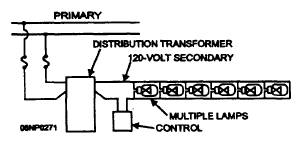 Figure 6-19.- Multiple street-lighting circuit. high-mechanical strength overcomes the difficulty. Conductor sag should be the same as for primary distribution. Constant-current regulators should be protected on overhead circuits by lightning arresters on both the primary and secondary sides. Multiple Circuits The multiple streetlight system uses a distribution transformer of the proper size as service equipment. (See fig. 6-19.) Notice that the transformer is fed directly through fuse cutouts from the base primary distribution system. The control for the circuit is connected into one line of the secondary side. The selection of output voltage of the transformer depends on the voltage required for the individual lamps that are installed. Depending on the types of lamps selected, this voltage may be from 120 volts to 480 volts. You must know the type of lamp that will be used in the circuit before you can properly select the transformer to feed the streetlight system. COMPONENTS AND CONTROLS There are many components required to construct an area lighting system. These include constant-current transformers, relays, controls, fixtures, wiring, and lamps. Controls can be manual, automatic, or a combination.