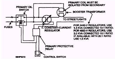 LIGHT CIRCUITS As we stated earlier, a number of light systems are in use today, such as streetlights, floodlights, and security lights. These systems are either series or multiple (parallel), depending on how they are used and the equipment available. SERIES AND MULTIPLE CIRCUITS The series circuit is supplied by a regulating transformer that gives a constant current, usually of 6.6 amperes, to the lighting circuit. If a higher amperage is required, autotransformers are available for stepping up the current to 15 or 20 amperes. This higher amperage permits the use of more rugged lamp filaments that give longer life for lamps of equal candlepower and higher lamp efficiency. The multiple (parallel) circuit consists of a number of streetlights supplied by a distribution transformer, delivering a constant low voltage to a circuit or secondary main that also supplies other loads; however, running secondary conductors any great distance to supply a parallel connected lamp or a group of lamps is impractical because of the excessive voltage drop. The cost of the multiple luminaire is low compared to the series type because the low voltage allows for the elimination of other luminaire accessories. This saving is largely offset, however, by the increased requirement for control devices and the copper wire cost. Lamp life and efficiency are comparatively low, and the illumination is not as uniform as in a series circuit. In choosing a system, here are a few suggestions that may aid in your selection. If the total wattage of the circuit exceeds 2 kilowatts or more than 15 lights, consider a series lighting system. When extending an existing system, use the existing circuit. If low-voltage capacity exists at the proposed location, use a multiple system, even though the load exceeds 2 kilowatts. When several small lights are to be spaced rather far apart and no low-voltage secondary exists along the route, use the series system regardless of the load size or the number of lights. When estimates show that one type of system will save money and time, use the more economical system. Series Circuits Let us consider a series streetlight system. The power for the circuit will be supplied from the base primary distribution lines, through fuse cutouts, to an oil switch, and from the oil switch to a constant-current regulator (fig. 6-16). The constant-current regulator will supply power to the series loops and, thus to the individual lamps. While the current (normally 6.6 amperes) remains constant, the voltage of the circuit is equal to the sum of the voltages of all the lamps plus the voltage drop in the wire. With enough lamps connected in series, the circuit can become a high-voltage circuit. The series circuit is easily controlled, but any break, such as a burned-out filament in a lamp, interrupts the