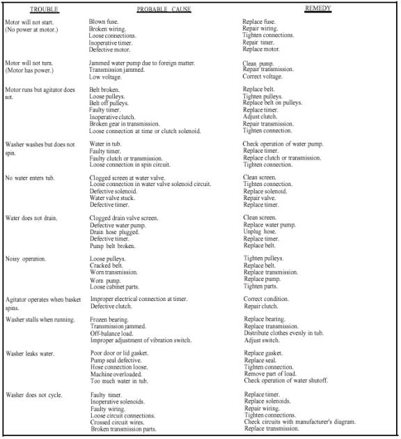 TROUBLE PROBABLE CAUSE REMEDY Motor will not start. Blown fuse. Replace fuse. (No power at motor.) Broken wiring. Repair wiring. Loose connections. Tighten connections. Inoperative timer. Repair timer. Defective motor. Replace motor. Motor will not turn. Jammed water pump due to foreign matter. Clean pump. (Motor has power.) Transmission jammed. Repair transmission. Low voltage. Correct voltage. Motor runs but agitator does Belt broken. Replace belt. not. Loose pulleys. Tighten pulleys. Belt off pulleys. Replace belt on pulleys. Faulty timer. Replace timer. Inoperative clutch. Adjust clutch. Broken gear in transmission. Repair transmission. Loose connection at time or clutch solenoid. Tighten connection. Washer washes but does not Water in tub. Check operation of water pump. spin. Faulty timer. Replace timer. Faulty clutch or transmission. Replace clutch or transmission. Loose connection in spin circuit. Tighten connection. No water enters tub. Clogged screen at water valve. Clean screen. Loose connection in water valve solenoid circuit. Tighten connection. Defective solenoid. Replace solenoid. Water valve stuck. Repair valve. Defective timer. Replace timer. Water does not drain. Clogged drain valve screen. Clean screen. Defective water pump. Replace water pump. Drain hose plugged. Unplug hose. Defective timer. Replace timer. Pump belt broken. Replace belt. Noisy operation. Loose pulleys. Tighten pulleys. Cracked belt. Replace belt. Worn transmission. Replace transmission. Worn pump. Replace pump. Loose cabinet parts. Tighten parts. Agitator operates when basket Improper electrical connection at timer. Correct condition. spins. Defective clutch. Repair clutch. Washer stalls when running. Frozen bearing. Replace bearing. Transmission jammed. Replace transmission. Off-balance load. Distribute clothes evenly in tub. Improper adjustment of vibration switch. Adjust switch. Washer leaks water. Poor door or lid gasket. Replace gasket. Pump seal defective. Replace seal. Hose connection loose. Tighten connection. Machine overloaded. Remove part of load. Too much water in tub. Check operation of water shutoff. Washer does not cycle. Faulty timer. Replace timer. Inoperative solenoids. Replace solenoids. Faulty wiring. Repair wiring. Loose circuit connections. Tighten connections. Crossed circuit wires. Check circuits with manufacturer's diagram. Broken transmission parts. Replace transmission. machine. It lists some of the troubles that can develop in a washer along with the probable causes and remedies for each.