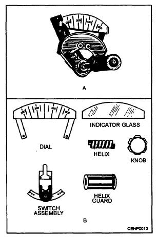Figure 7-13.- A. Helix control; B. Helix components. Helix Control A helix control (fig. 7-13, view A) is used in some domestic, semi-commercial, and commercial installations. It is operated by thermostatic metal that coils and uncoils when heat is applied, regulating a switch to make and break the electric circuit. Repairing this unit consists of replacing miscellaneous parts, such as the dials, switch assembly, helix, helix guard, and so on (fig. 7-13, view B). Hydraulic Control A hydraulic control is probably the most frequently used control for automatically regulating the temperature of cooking appliances. In this control, a capillary tube filled with fluid is connected to hydraulic bellows (fig. 7-14). A bulb located on one end of the capillary tube is filled with fluid and then is put in the heat zone. It transfers heat-created pressure through the capillary to the diaphragm. The expanding diaphragm presses a system of levers that snap the electrical contacts open, thus cutting off electrical current to the controls. Automatic recycling takes place with slight temperature drops, maintaining a constant set temperature. the two small, slotted lock screws (fig. 7-14) that are behind the dial. Now, with one hand, hold the main center hub of the control and move the slotted adjusting plate to the right to raise the temperature or to the left to lower the temperature. That is a delicate adjustment, so move the dial a little at a time. Certain types of hydraulic controls have a safety device, normally set at 450 F, that trips upon reaching the set temperature and requires manual resetting. It may take several hours before the appliance has cooled down enough to allow the operator to reset the unit. If you find that the circular slots in the adjusting plate prevent you from turning the plate for the desired temperature change, remove the two lock screws carefully so you can move the adjusting plate a full 180 degrees. Replace the two adjusting screws and continue the calibration process as before. Repairing a hydraulic control is usually limited to adjusting the temperature setting to correspond with the temperature recorded in the appliance. You can adjust the temperature control by loosening, but not removing, A timer is used to control a circuit to an appliance automatically or give a warning to the operator that a predetermined time has lapsed. Figure 7-15 shows a typical wiring diagram of an electric range single-pole oven timer.