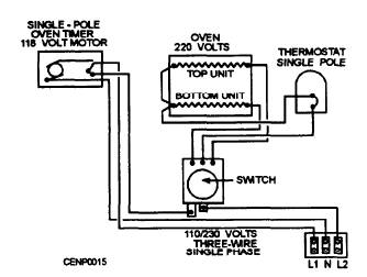 Figure 7-15.- Single-pole oven timer wiring schematic. APPLIANCE AND EQUIPMENT MAINTENANCE, REPAIRS, AND TROUBLESHOOTING One of the primary responsibilities of a CE is to ensure proper operation of switches and elements used in appliances and equipment. That can be done by developing and following a good inspection and maintenance program. Periodically, you should check all equipment for loose connections, burned or pitted contacts, and the improper mounting of switches. You should also check for bad connections, improper mounting, and loose or broken insulators on coils or ribbon elements. Identifying and locating problems within circuits, appliances, and equipment is a challenging job. This phase of your rating as a Construction Electrician (CE) working within a maintenance shop is where much of your career will be spent. The inspection and maintenance of switches and elements on appliances and equipment go hand in hand, and, in most cases, a problem discovered during inspection is corrected on the spot and requires no further work until the next inspection.