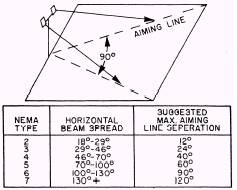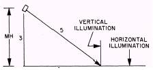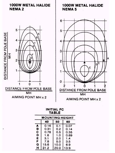 Figure 1-22.\Maximum candlepower of illumination. Select lighting fixtures with a beam spread greater than the area being lighted. Where several units are required, good lighting overlap occurs when the edge of the beam of one fixture coincides with the aiming point of the adjacent fixture. By examining the shape (beam spread) of the lighting pattern emitted by the fixture, you can begin the process of selecting the NEMA type floodlight best suited for the application. Horizontal and vertical lumen distribution is stated on each photometric test. Generally, the more concentrated the luminous intensity (candela), the tighter the beam spread. For instance, the NEMA Type 2 Power SpotR floodlight has a beam spread of 22 horizontal by 21 vertical, whereas a NEMA Type 5 has a beam spread of 77 horizontal by 77 vertical. The isofootcandle diagrams shown in