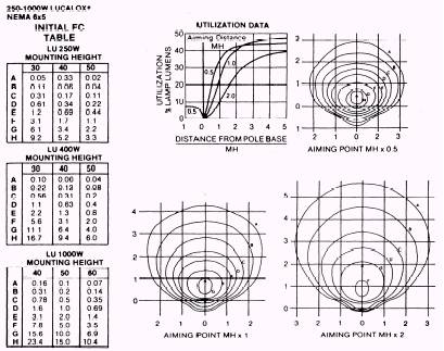 MANUFACTURER'S LITERATURE The performance specifications of each model, type, and size of luminaire are provided with the fixture or obtained from the manufacturer's ordering catalog. A working knowledge of this information will assist you in selecting and installing the correct floodlight to accomplish the job. Figure 1-25 shows the manufacturer's literature provided with a General Electric, 250- to 1,000-watt, LucaloxR, HLX PowerfloodR luminaire. ISOFOOTCANDLE DIAGRAMS The isofootcandle diagrams show what the light level will be at any given point. The dimensions for the diagram are based on the mounting height (MH) of the floodlight. The aiming point () is also based on the mounting height. Figure 1-25 provides a diagram for mounting heights of MH 0.5, MH 1, and MH 2. The grid pattern is also based on the mounting height. The grid line values left and right give the distance to either side of the floodlight. The values up the side show the distance in line with the aiming direction of the floodlight. The number 3, for instance, represents 3 40, or 120, feet from a 40-foot mounting height. Each isofootcandle line shows where the footcandle level is the same. These lines are identified by a letter, which is used with the initial footcandle (fc) table. The footcandle values between isofootcandle lines do not change more than 2 to 1. This makes it possible to approximate the level between lines. The initial footcandle table gives the footcandle value for each isofootcandle curve at a specific mounting height. The values for each