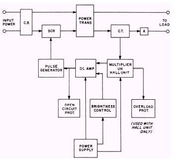 Constant-Current Regulator Runway lighting systems are supplied from series circuits served by constant-current regulators (CCRs). Each lighting circuit on the airfield has a separate regulator. The CCRs maintain the output current throughout its rated output value, depending on the load. Some of the regulators are equipped with brightness controls. These brightness controls adjust the brightness of the lamps in the lighting system to compensate for visibility conditions. The CCR uses solid-state devices to maintain a constant-current level in its respective lighting system. The regulators are silicon-controlled rectifiers (SCRs) in a feedback circuit to obtain a constant-current output instead of resonant circuits, moving transformer elements, or saturable reactors. The SCRs are controlled to vary the part of a cycle during which the current is permitted to flow into the load circuit. In the load circuit, the current is maintained constant at any value preset with the brightness control by means of a feedback circuit as the load resistance is varied from maximum to zero. The block diagram (fig. 2-3) shows the elements constituting the regulator. Load current is measured by the current transformer and the Hall unit or multiplier unit, which has an output voltage proportional to the square of the load current. The Hall or multiplier output is filtered and fed into the input of an amplifier and compared with an input from a brightness control potentiometer. The output voltage is a function of the difference between the two inputs. The output voltage is applied to the input of the gate pulse generator that determines the condition angle of the SCRs and changes it to bring the system to equilibrium. Transient overload protection is provided for the semiconductor element of the Hall unit. Open-circuit protection is provided when no current is drawn by the load and the brightness potentiometer output voltage is any value other than zero. Under these conditions, the SCRs will be prevented from
