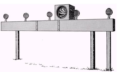 Figure 2-11.\Elevated approach light bar. The brightness of the strobe lights cannot be controlled. knowledge of one will give you an understanding of the others. The strobe lights put out a high beam of light that peaks at 30 million candlepower. DO NOT LOOK INTO THE BEAM OF LIGHT WHEN YOU ARE NEAR ONE OF THE LAMPS OR YOUR EYES COULD BE DAMAGED. The system we discuss here is one of several different types manufactured. The operation is the same way no matter who manufactures them. Strobe lights are either flush mounted or elevated. Since the components are easier to see on an elevated unit, we will illustrate our discussion with an elevated unit, as shown in figure 2-12. The operation of the flush light is exactly the same as that of the elevated light unit. The main difference between the units is the way the components are arranged.