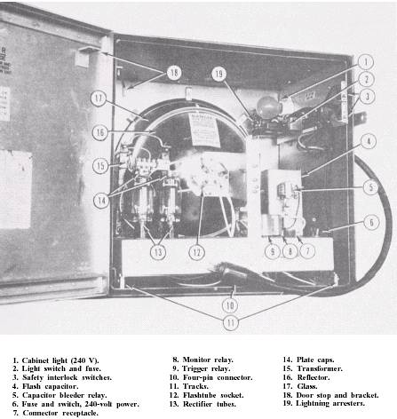 Each strobe light has four inputs from the rest of the system: (1) 240 volts ac, (2) ground, (3) 120 volts ac timing pulses at the rate of two per second, and (4) a dc voltage connection to the monitor system. These inputs are plugged into a cable through a four-pin connector (No. 10). The unit steps up the 240 volt ac input voltage to 1,460 volts ac with a transformer (No. 15) and passes this voltage through a full-wave rectifier circuit of vacuum tubes (No. 13). The resultant 2,000 volts dc is applied to the electrodes of a flashtube and across the flash capacitor (No. 4). The xenon-filled flashtube will fire only when ionization is initiated by a trigger pulse of about 5,000 volts applied to its third electrode. This pulse is supplied by a trigger coil. At the same time that the flash capacitor is storing its charge, the trigger capacitor is also being charged by the primary of the trigger coil, which is an autotransformer and cuts the bleeder resistors in series out of the circuit. When the 120 volt ac timing signal arrives, it is applied to the coil of the trigger relay (No. 9), thus closing the relay contacts, allowing the trigger capacitor to discharge through the primary of the trigger coil. This generates the necessary trigger pulse in the secondary of the trigger coil, the flashtube fires, and the flash capacitor discharges across the flashtube electrodes. The flash capacitor discharges down to the deionization potential of the flashtube, at which point the tube becomes a nonconductor. The light-producing arc ceases, and the charge cycle begins again. The charge stored in the flash capacitor is a potential safety hazard. To make sure that the capacitor is discharged when the light unit is shut off, provide a discharge circuit by a series of bleeder relays. The bleeder relay (No. 5) closes this discharge circuit when the power to the transformer is turned off. The current that charges the flash capacitor creates a pulse voltage in a surge resistor twice each second. A part of this voltage is applied to a silicon rectifier through a tap-off of the surge resistor. The rectified voltage is then filtered and applied to the monitor relay. The value of this voltage is sufficient to keep the monitor relay energized when the unit is flashing normally. When the unit stops operating because of a component failure in the unit, the absence of the pulse voltage at the surge resistor will allow the contacts of the monitor relay to close. This action completes a circuit from the monitor connection through a monitor resistor of 22 kilohms to ground. The monitor and control chassis react to the ground by warning the operator.