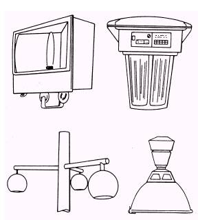 Fluorescent lamps of high-pressure, hard glass are now being used to some extent for floodlighting where a low-level, highly diffused light is desired. This would include club parking lots, outside shopping areas, parks, or grass areas. This bulb is much the same in operation as the mercury-vapor lamp with the exception that the fluorescent tube has an inside coating of material called phosphor that gives off light when bombarded by electrons. In this case, the visible light is a secondary effect of current flow through the lamp. As with other electric-discharge lamps, the fluorescent lamp requires a ballast for operation. The color produced by the light depends on the phosphor material used. Luminaire Ballasts Every electric-discharge lamp needs a ballast to operate. The ballast is simply a coil of insulated wire wound on a frame, or a laminated iron core. Ballasts may perform any or all of the following functions: Limit the current flow through the lamp to the value for which the lamp is designed. Cause a drop in line voltage and provide the desired lamp voltage, which, in turn, determines the rated current in the lamp. Provide power factor correction. Provide radio interference suppression. The ballast core is made of laminated transformer steel wound with copper or aluminum magnet wire. The assembly is impregnated with insulating material that provides electrical insulation while aiding in heat dissipation and, with leads attached, is placed into a case. The case is filled with a potting material containing a filler, such as silica. This compound completely fills the case encapsulating the core, coil, and capacitor. Average ballast life at a 50-percent duty cycle and at proper ballast operating temperature is normally estimated at about 12 years. At higher ballast temperature or longer duty cycle, shorter ballast life will result. According to the National Electrical CodeR, (NECR)1, Article 410-73e, it is mandatory that all fluorescent lamp ballasts used indoors be internally protected and that replacements for these ballasts be integrally protected. These protective measures were taken to prevent misapplication of the ballast as well as to protect against undesirable failure and conditions which can occur at the end of ballast life. The thermally protected Underwriters' Laboratories approved ballast is known and marked, or labeled, as "Class P." The operating characteristics of the ballast may result in a low- or high-power factor. The measured watts of a low-power-factor ballast are approximately the same as the measured watts of the high-power-factor ballast when they are connected to the same load. The low-power-factor ballast draws more current from the power supply, and therefore, larger supply conductors may be necessary. The high-power-factor ballast permits greater loads to be carried by the existing wiring system. Fixtures There are fixture configurations to meet almost any lighting requirement or design. While the basic purpose of the fixture is to hold and prevent damage to the lamps and lamp sockets, 1 National Electrical CodeR and NECR are registered trademarks of the National Fire Protection Association, Inc., Quincy, MA. the fixture also helps direct the light beams into the lighting patterns desired. The fixture, with its reflector and lens, determines the quality of the light being produced. Reflectors can either concentrate or diffuse light rays, and the lens can pass or refract light rays. Quite often, the lens may be used to do both from one light source; that is, part of the light rays are refracted to produce a soft, even spread of light in the outer part, while the light rays are concentrated in other areas of the lens to produce a bright, hard light at a specific area. Some streetlight fixtures are examples of this. The sides of the lenses produce a general diffused lighting to prevent blinding automobile operators while, at the same time, they produce a bright light pattern below the lamp along the curb. Flood or security lighting fixtures may be either open or enclosed. The open fixtures provide higher maintained efficiency and more accurate beam control. The open fixture will, under some conditions, require a "hard glass" bulb to prevent bulb breakage caused by rain, snow, or insects striking the hot bulb. Most fixtures will have provisions for mounting ballasts (transformers) within the fixture and will provide protection for the ballast. In some cases, particularly in high bay lighting, the ballasts may be mounted at some central location and not mounted in the fixture. Figure 1-2 shows representative samples of the styles of fixtures