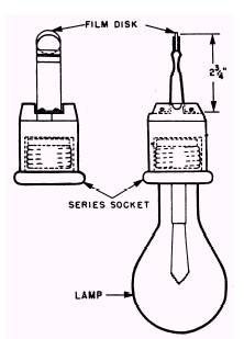 Figure 1-3.\Series lamp, socket, and film disk. prevents lamp failure from interrupting the circuit. The multiple (parallel) circuit consists of a number of streetlights supplied by a distribution transformer delivering a constant low voltage to a circuit or secondary main which also supplies other loads. However, running secondary conductors any great distance to supply a parallelconnected lamp or a group of lamps is impractical because of the excessive voltage drop. The cost of the multiple luminaire is low compared to the series type because the low voltage allows for the elimination of other luminaire accessories. This saving is largely offset, however, by the increased requirement for control devices and the copper wire cost. Lamp life and efficiency are comparatively low and the illumination is not as uniform as in the series circuit. In choosing a system, here are a few suggestions which may aid in your selection. If the total wattage of the circuit exceeds 2 kilowatts or more than 15 lights, consider a series lighting system. When extending an existing system, use the existing circuit. If low-voltage capacity exists at the proposed location, use a multiple system even though the load exceeds 2 kilowatts. When several small lights are to be spaced rather far apart and no low-voltage secondary exists along the route, use the series system regardless of the load size or the number of lights. When estimates show that one type of system will save money and time, use the more economical system. |