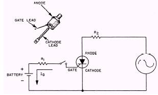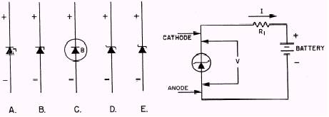 ZENER DIODE A zener diode (fig. 4-3) is designed to allow a current to flow through it in a direction that is reverse to the normal flow of current that would occur if it were used as a rectifier. Current can flow through a zener diode in both directions. In the forward direction, current will flow at a low voltage, usually about 1 volt. In the reverse direction, no current will flow until the voltage impressed across it is equal to the zener voltage. At this point, a current will flow and an extremely small increase in voltage will cause a large increase in current. Most importantly, it should be noted that the current flow through the zener diode is in the reverse direction to that of a normal rectifier. When the zener diode is connected to a source of direct current through a resistor of the correct value, the voltage drop across it can be made to be relatively constant or remain at the same value with wide variations or changes in the voltage of the direct current source. With care in selection of the zener diode and the series resistor, the voltage drop across the diode will remain the same regardless of changes in the source voltage and temperature. The purpose of the zener diode is to provide a voltage reference. SILICON CONTROLLED RECTIFIER Figure 4-4 shows the physical outline and the schematic symbol of the silicon controlled rectifier (SCR). The SCR looks much like an ordinary rectifier and has many of its characteristics. Current will flow through the SCR in only one direction, from the cathode to the anode. Unlike the rectifier, the SCR must be electrically turned on before any current will flow through it. A current from an external source must flow from the cathode to the gate to turn it on. When the SCR is turned on by this method, it is said to be "fired." Circuits that supply this firing current are called firing circuits. Another characteristic of the SCR is its ability to stay turned on or fired without the need of a continuous current or signal supplied to the gate. It will remain turned on even if the gate signal is cut off until the current flow of the alternating current main supply reverses its direction of current flow. Because the SCR cannot conduct in the opposite direction, no current will flow and