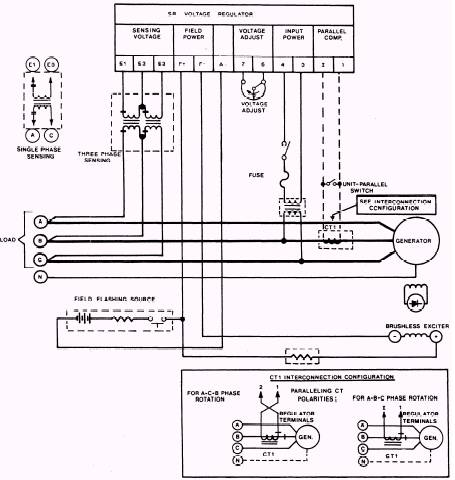 Figure 4-11.\Parallel compensation interconnection diagram. across R25 (and T3 windings) leads the sensing voltage by 90 degrees, and the vector sum of the two voltages is nearly the same as the original sensing voltage; consequently, almost no change occurs in generator output voltage. When an inductive load (lagging power factor) is applied to the generator, the voltage that appears across R25 becomes more in phase with the sensing voltage, and the combined vectors of the two voltages result in a larger voltage being applied to the sensing rectifiers. Since the action of the regulator is to maintain a constant voltage at the sensing rectifiers, the regulator reacts by decreasing the generator output voltage. When a leading power factor (capacitive) load is applied to the generator, the voltage across R25 becomes out of phase with the sensing voltage. The combined vectors of the two voltages result